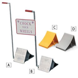 VESTIL Aluminum Chocks with handle and sign. 3/8" long cleats to provide superior holding power. Ribbed wheel area grips tire securely. 36" high handle and CHOCK YOUR WHEELS sign.
